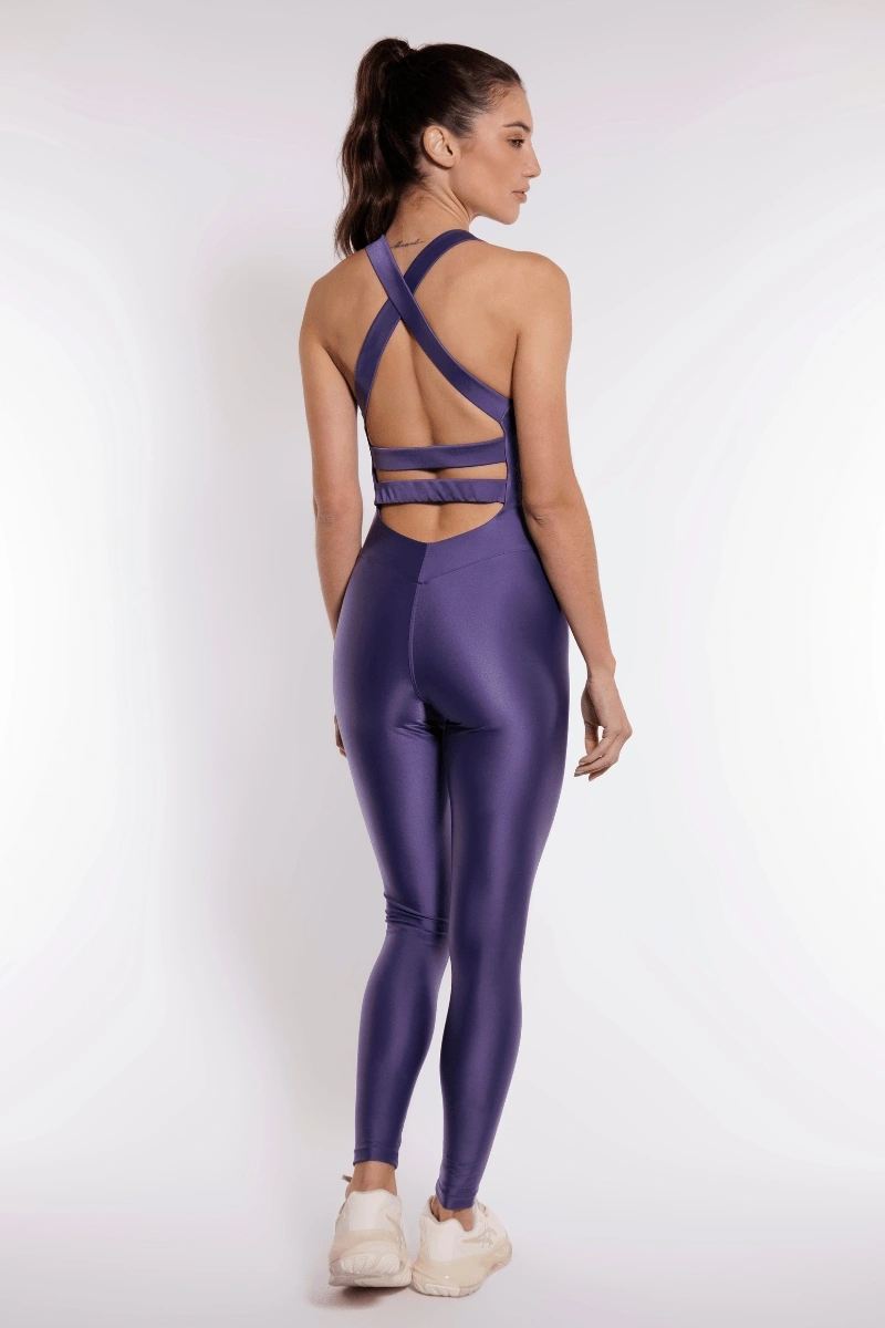 Macacão com alças elásticas cruzadas nas costas, bojo amovível e modelagem que valoriza o corpo.