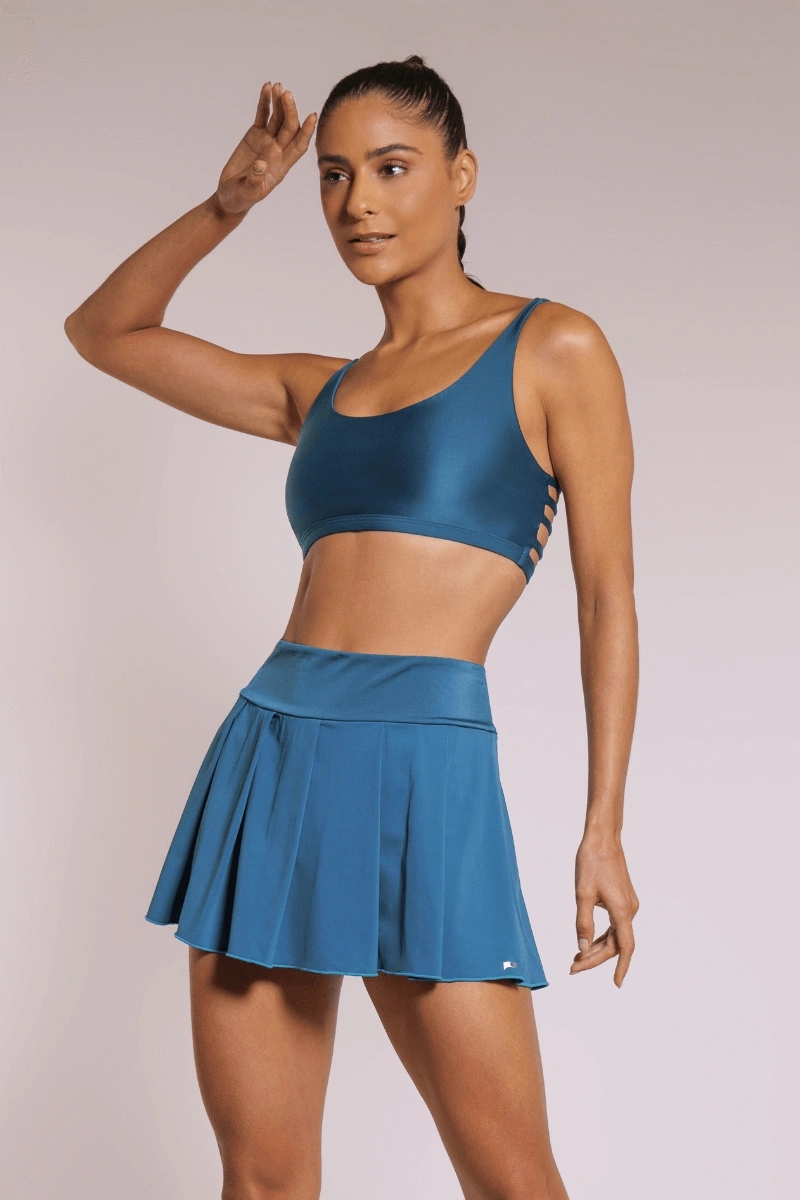 Saia com pregas em tecido leve, que proporciona conforto térmico e liberdade de movimento.